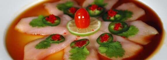 Thinly sliced seared tuna with mixed greens, avocado & cherry tomatoes in Ponzu vinagrette